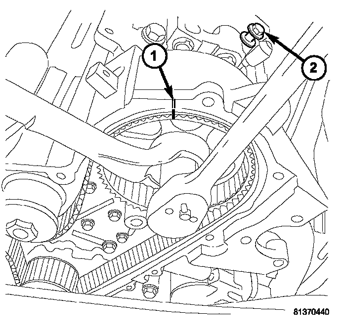 Remove the outer timing covers. Rotate the crankshaft until the pointer on the crankshaft sprocket (10) aligns the TDC mark on the oil pump (9). Check to determine if the camshaft sprocket (2, 7) timing marks (1, 8) are aligned with the marks on the inner timing cover. It may take an additional full revolution of the crankshaft before the camshaft sprocket marks are aligned.