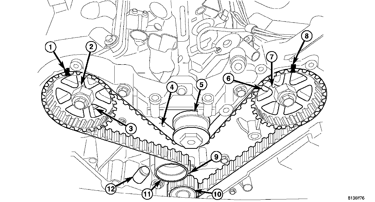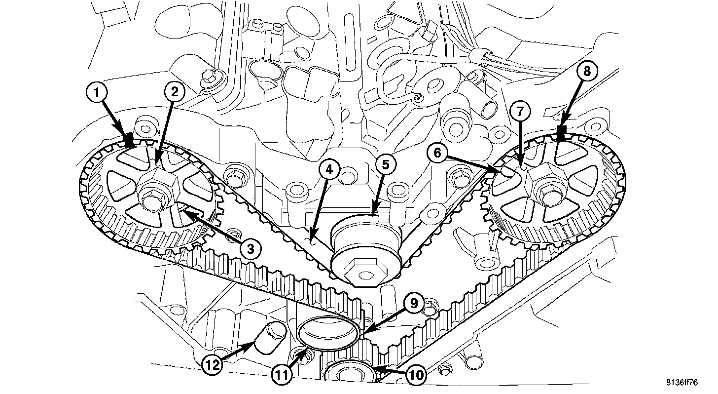 7. Remove the timing belt tensioner (12) and remove timing belt.