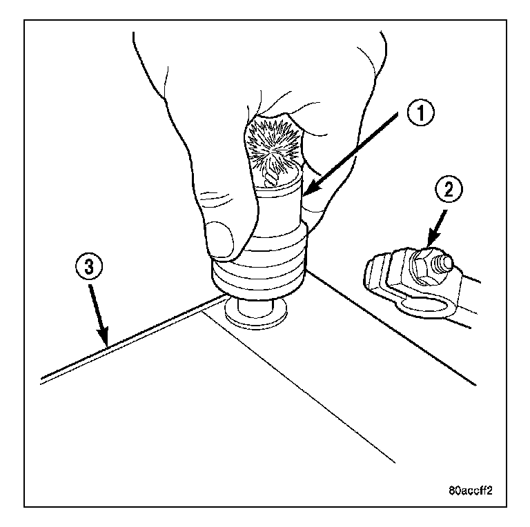 4. Clean any corrosion from the battery terminals with a wire brush or terminal cleaner (1), and a sodium bicarbonate (baking soda) and warm water cleaning solution.