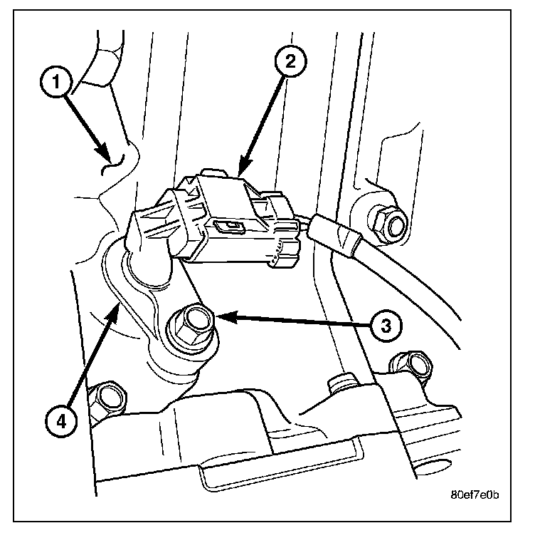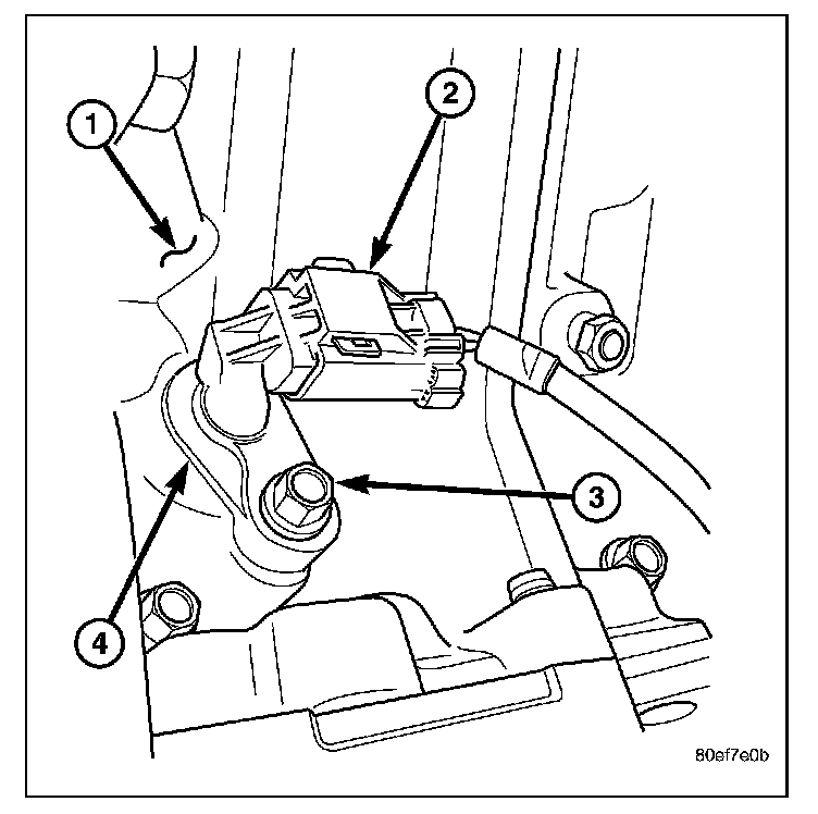 The Crankshaft Position (CKP) sensor (4) is located at the right-rear side of the engine cylinder block (1). It is positioned and bolted into a machined hole in the engine block.