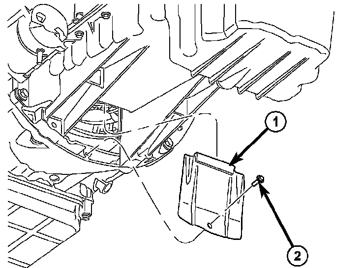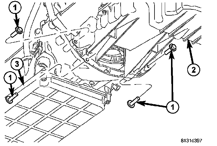 25. Position the heat shield (2) onto the transmission housing and install the screw (1) and bolt (3) to hold the shield in place.