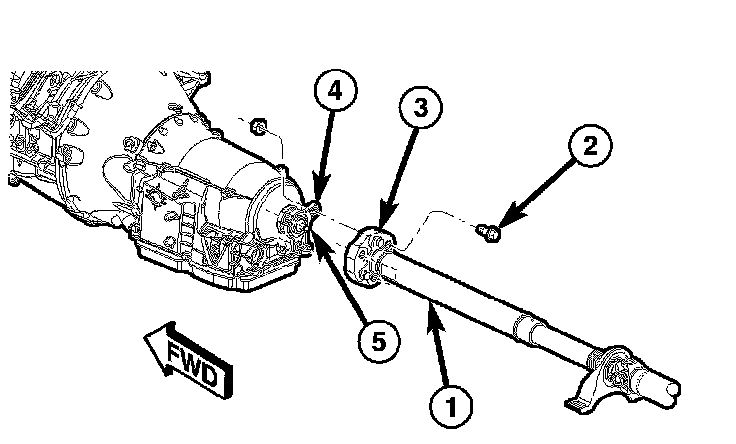5. Slide the propeller shaft (1) rearward until the coupler clears the propeller shaft pilot (5) on the transmission output shaft.