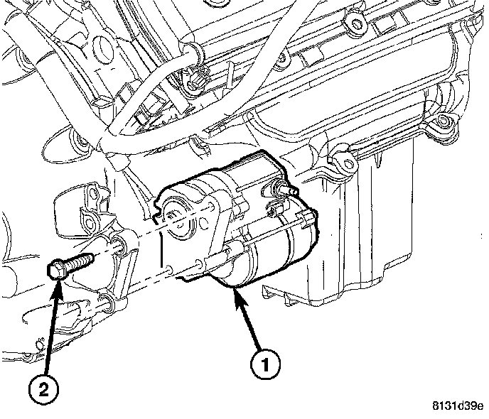 6. Remove the bolts (2) holding the starter motor (1) to the transmission.