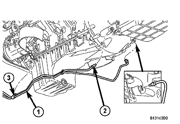 18. Disconnect transmission fluid cooler lines (1) at transmission fittings (2) and clips (3).
