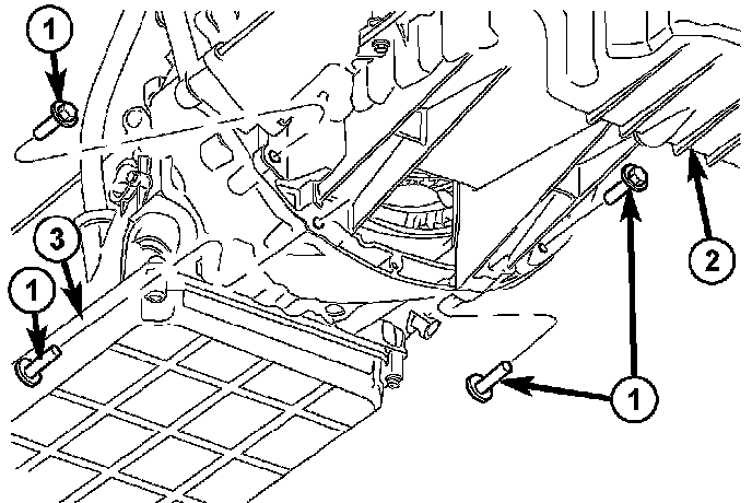 14. Remove bolt (3) and screw (1) holding the heat shield (2) to the transmission.
