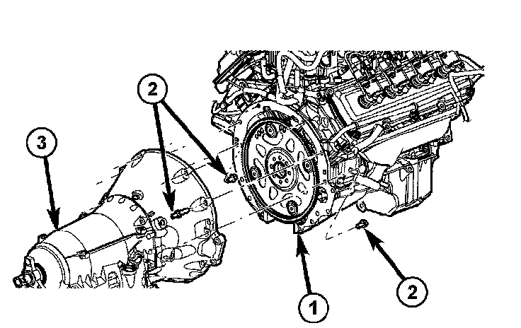 25. Remove all remaining bolts (2) holding the engine (1) to the transmission (3).