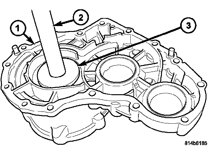 6. Install the front output shaft rear bearing race into the rear housing (1) with Handle C-4171 (2) and Installer D-130 (3).