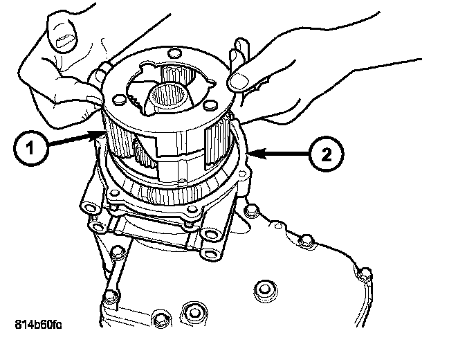 24. Install the planetary gear system (1) into the transfer case rear housing (2).