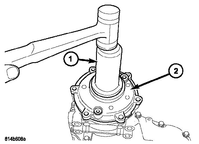 33. Install the rear output shaft seal from the transfer case cover (2) with Installer C-3860A (1).