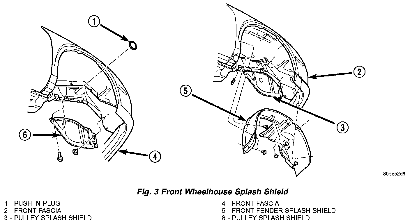 3. Remove push-in fasteners attaching splash shield to frame rail forward of suspension (Fig. 3).