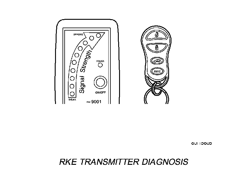 Using special tool 9001, first test to ensure that the transmitter is functioning. Typical testing distance is 2.5 centimeters (1 inch) for Asian transmitters and 30.5 centimeters (12 inches) for all others. To test, position the transmitter as shown . Press any transmitter button, then test each button individually. The tool will beep if a radio signal strength that lights five or more LED's is detected. Repeat this test three times. If transmitter fails any of the test refer to the Diagnostic Procedures manual.