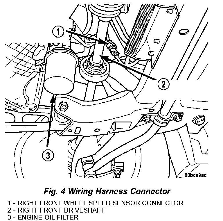 2. Disconnect the wheel speed sensor cable connector from the wiring harness on the inside of the frame rail above the front suspension crossmember (Fig. 4). The connector has a locking tab which that must be pulled back before the connector release tang can be depressed, releasing the connection.