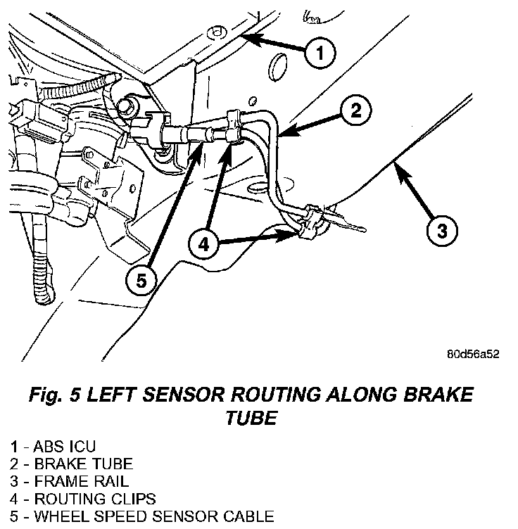 5. If the sensor being installed is the left front, clip the speed sensor cable to the brake tube on the inside of and under the frame rail (Fig. 5).