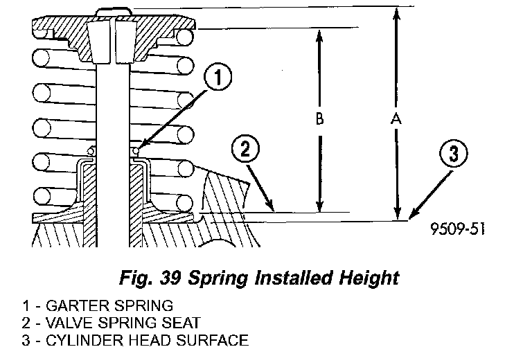 5. Check the valve spring installed height after refacing the valve and seat (measurement B) (Fig. 39). Make sure measurements are taken from top of spring seat to the bottom surface of spring retainer. If height is greater than 40.18 mm (1.58 inch), install a 0.762 mm (0.030 inch) spacer under the valve spring seat to bring spring height back within specification.
