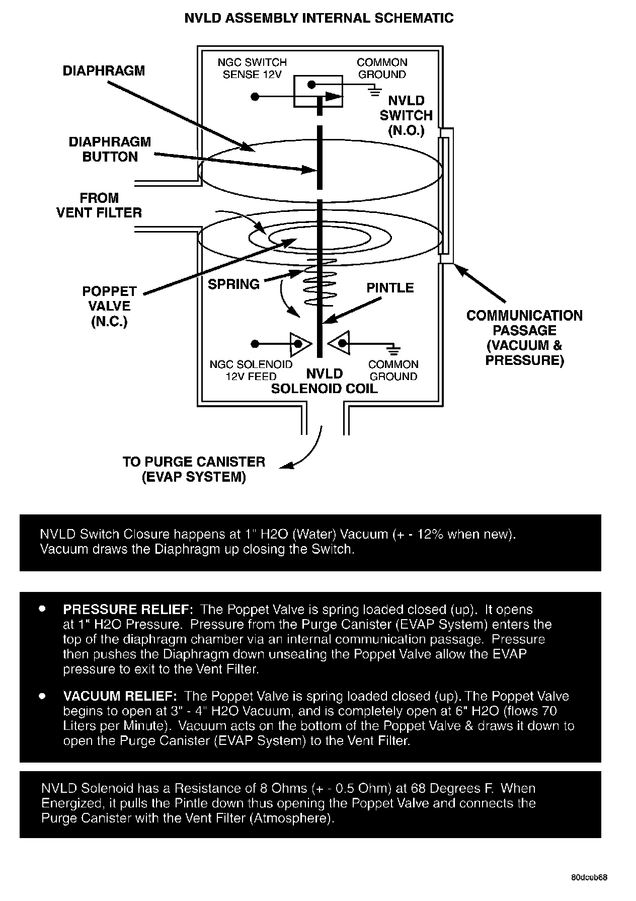 The Natural Vacuum Leak Detection (NVLD) system is the next generation evaporative leak detection system that will first be used on vehicles equipped with the Next Generation Controller (NGC) starting in 2002 M.Y. This new system replaces the leak detection pump as the method of evaporative system leak detection. The current CARB requirement is to detect a leak equivalent to a 0.0209 inches (0.5 mm) hole. This system has the capability to detect holes of this size very dependably.