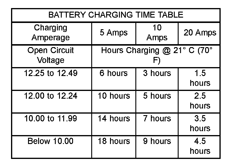 See the Open-Circuit Voltage Table. This voltage reading will indicate the battery state-of-charge, but will not reveal its cranking capacity. If a battery has an open-circuit voltage reading of 12.4 volts or greater, it may be load tested to reveal its cranking capacity .