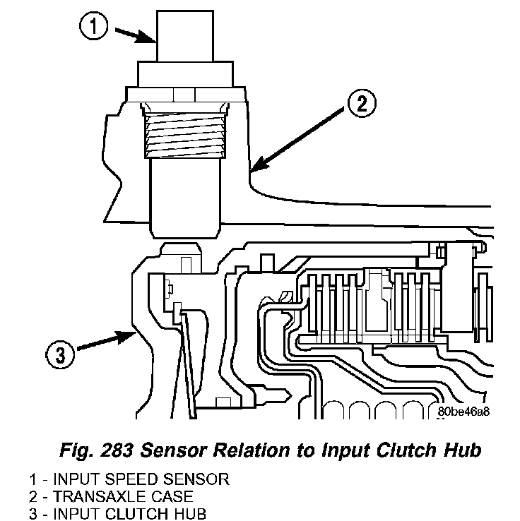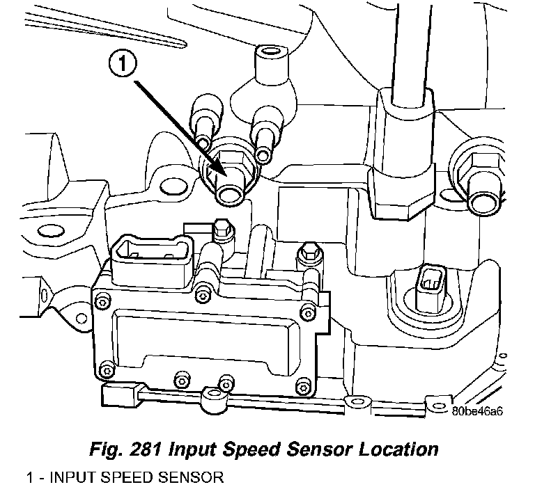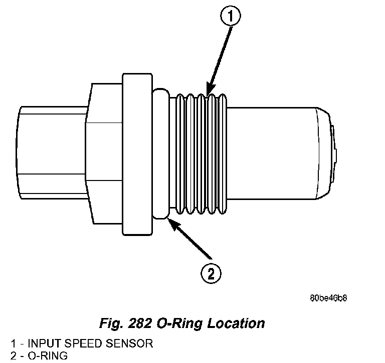 The Input Speed Sensor is a two-wire magnetic pickup device that generates AC signals as rotation occurs. It is threaded into the transaxle case (Fig. 281), sealed with an O-ring (Fig. 282), and is considered a primary input to the Powertrain/Transmission Control Module.