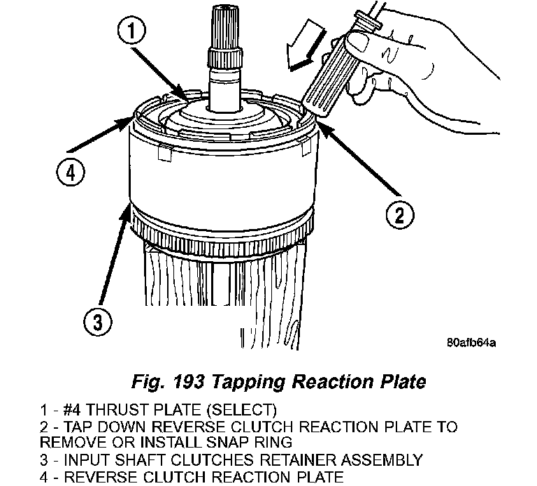 2. Tap down reverse clutch reaction plate to release pressure from snap ring (Fig. 193).