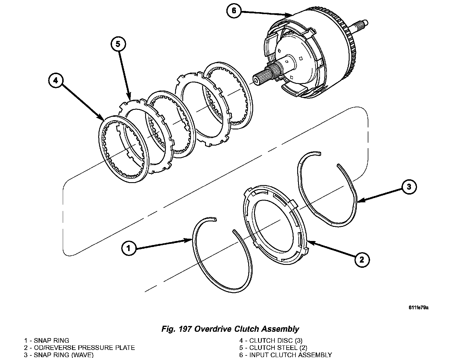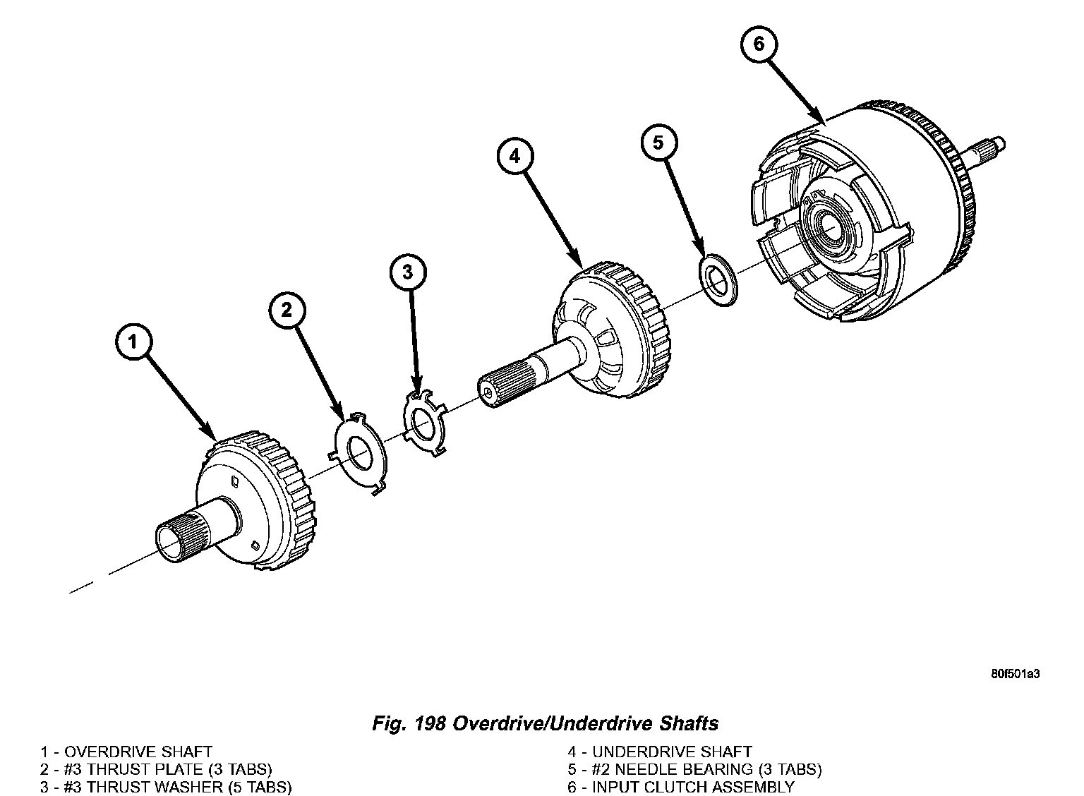 10. Remove and inspect OD and UD Shafts, as well as #3 thrust washer and plate, and #2 needle bearing (Fig. 198).