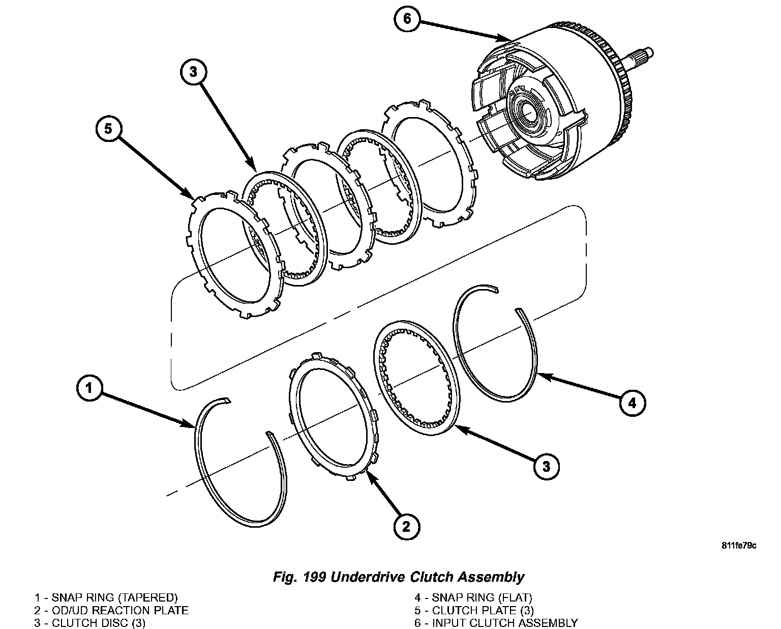 12. Remove the UD clutch flat snap ring and rest of UD clutch pack (Fig. 199). Tag clutch pack for assembly identification.