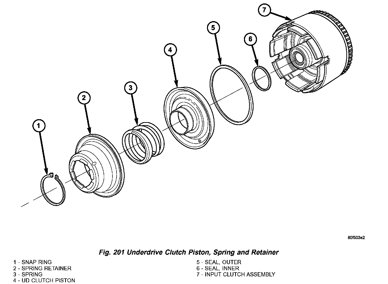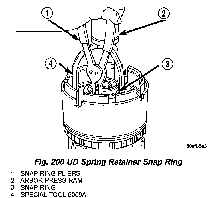 13. Using Tool 5059A and an arbor press, compress UD clutch piston/spring enough to remove snap ring (Fig. 200) (Fig. 201).