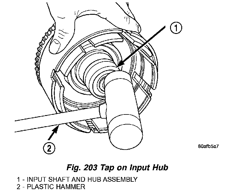 16. Tap on input hub with soft faced hammer and separate input hub from OD/Reverse piston and clutch retainer (Fig. 203).