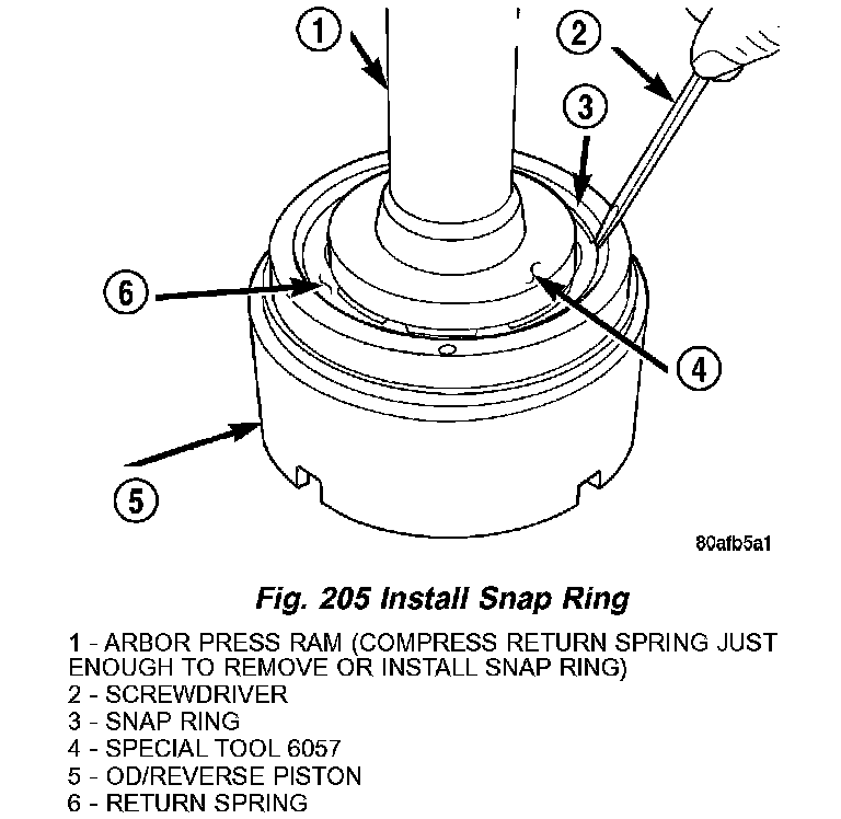 18. Using Tool 6057 and an arbor press, compress return OD/Reverse piston return spring just enough to remove snap ring (Fig. 205).