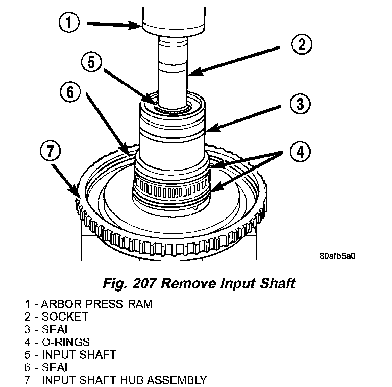 20. Using a suitably sized socket and an arbor press, remove input shaft from input shaft hub (Fig. 207).