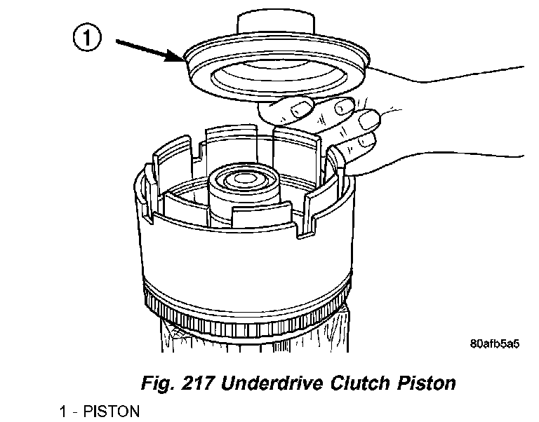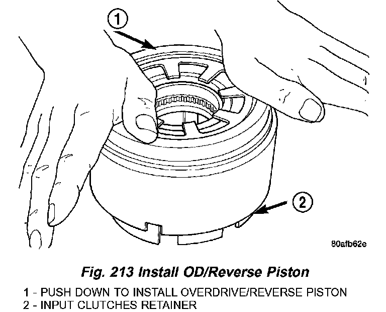 4. Install the OD/Reverse piston assembly to the input clutch retainer as shown in (Fig. 213).