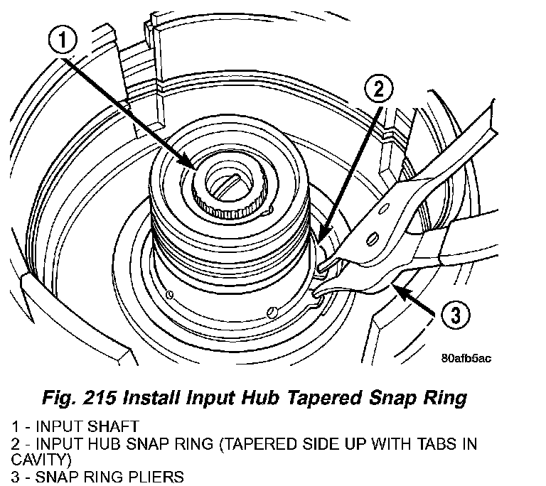 6. Install input hub tapered snap ring (Fig. 215) (Fig. 216).