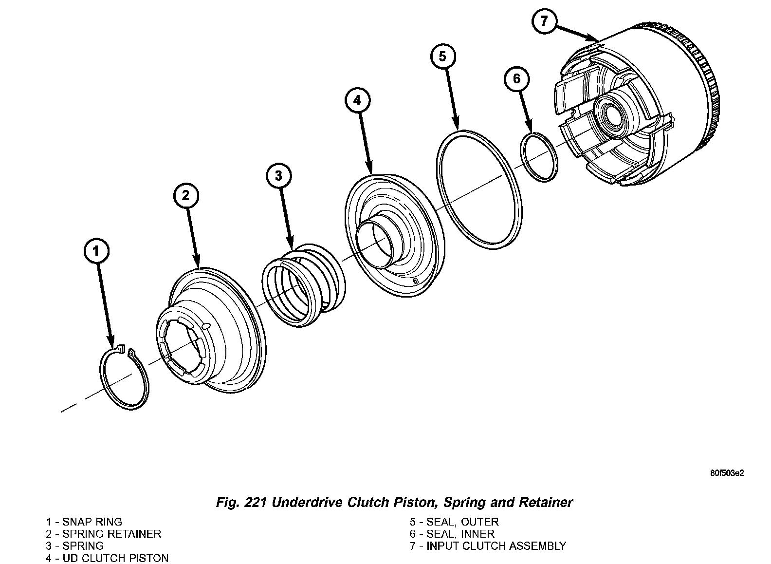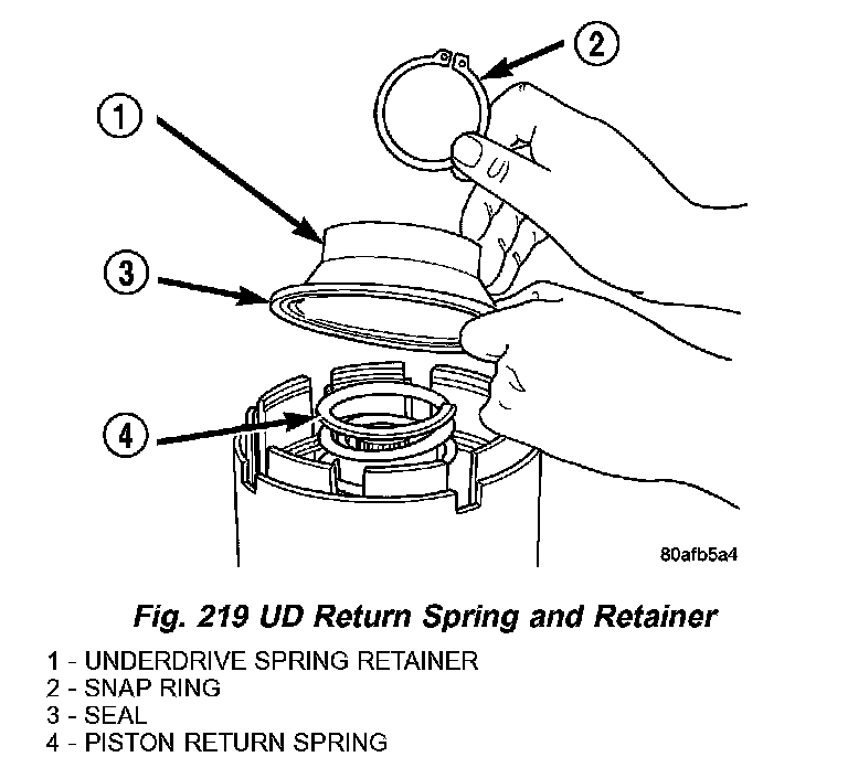 9. Using Tool 5059A and an arbor press, Install the UD spring retainer and snap ring (Fig. 219) (Fig. 220) (Fig. 221) Compress just enough to install snap ring.