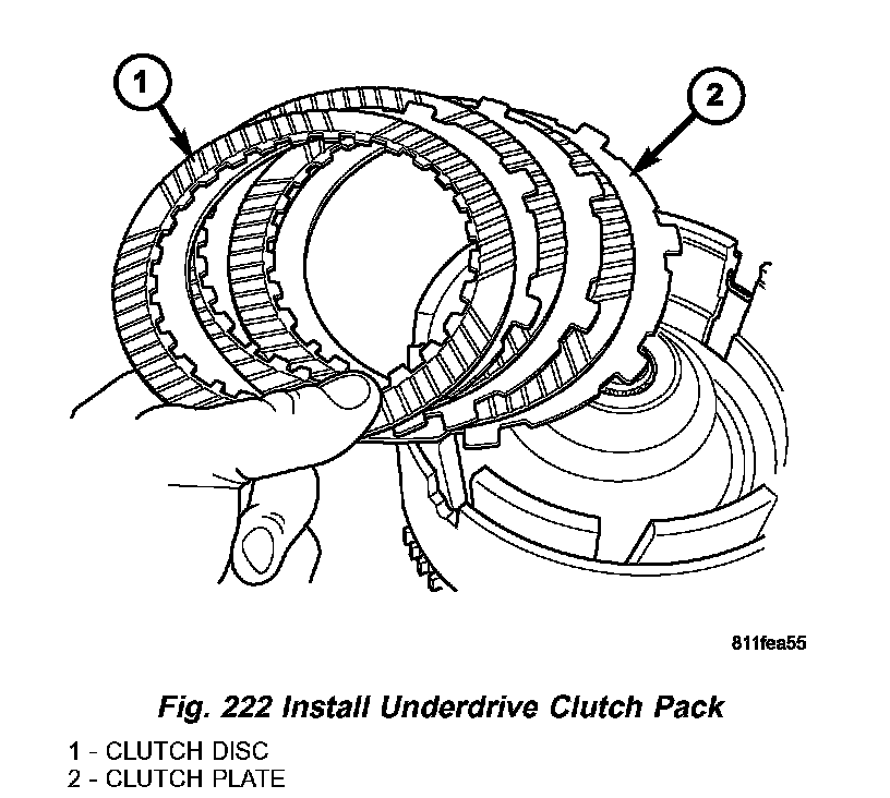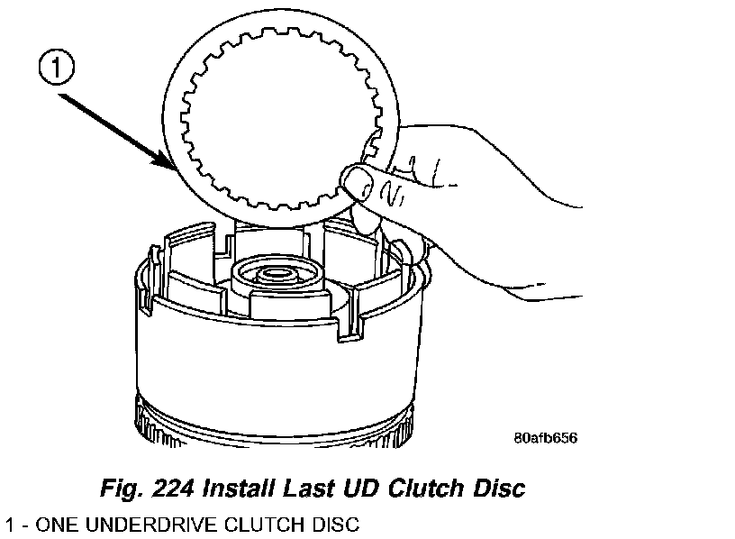 10. Install the UD clutch pack. Leave out upper disc, until snap ring is installed (Fig. 222).