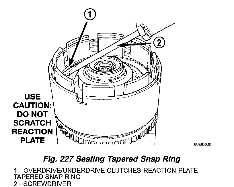 13. Install the OD/UD clutch reaction plate and snap ring (Fig. 225) (Fig. 226). The OD/UD clutches reaction plate has a step on both sides. Install the OD/UD clutches reaction plate tapered step side up.