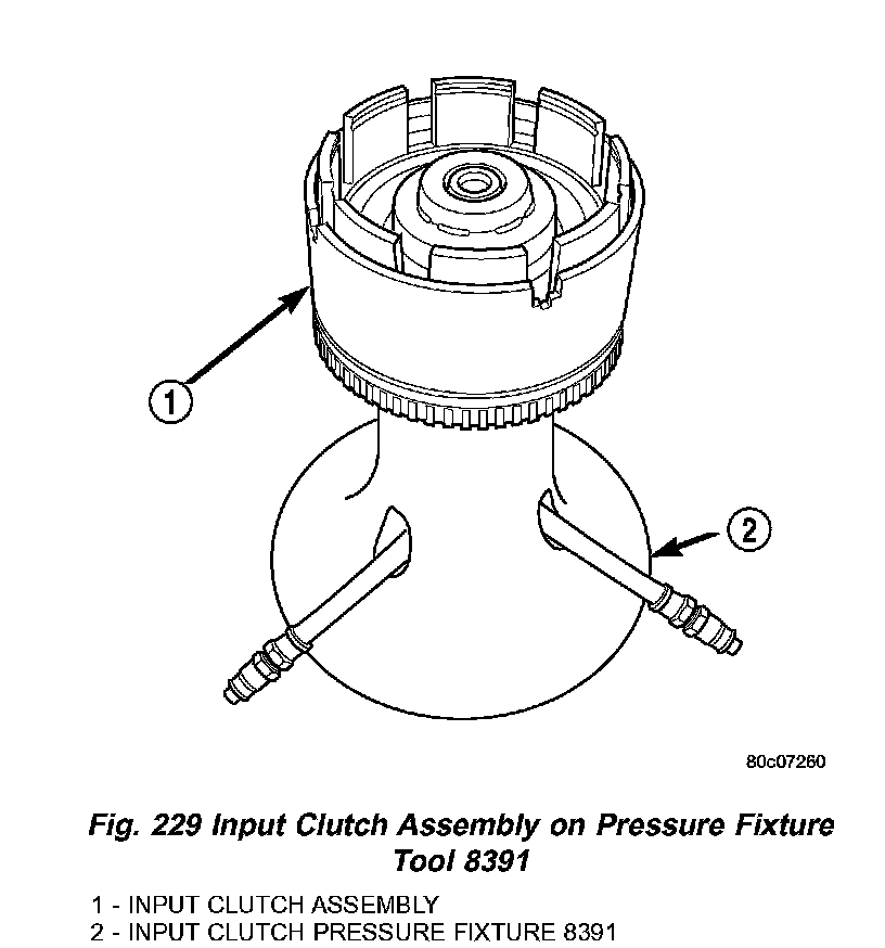 15. Install input clutch assembly to the Input Clutch Pressure Fixture-Tool 8391 (Fig. 229).