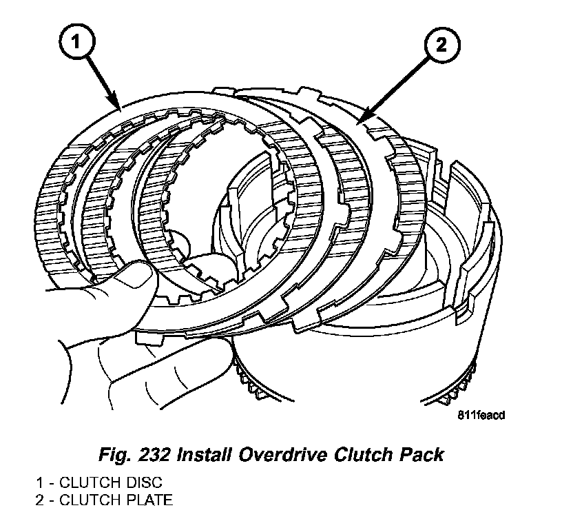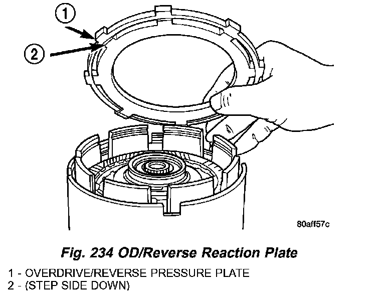 23. Install the OD/Reverse pressure plate with large step down (towards OD clutch pack) (Fig. 234).