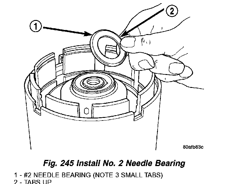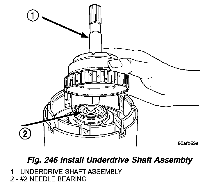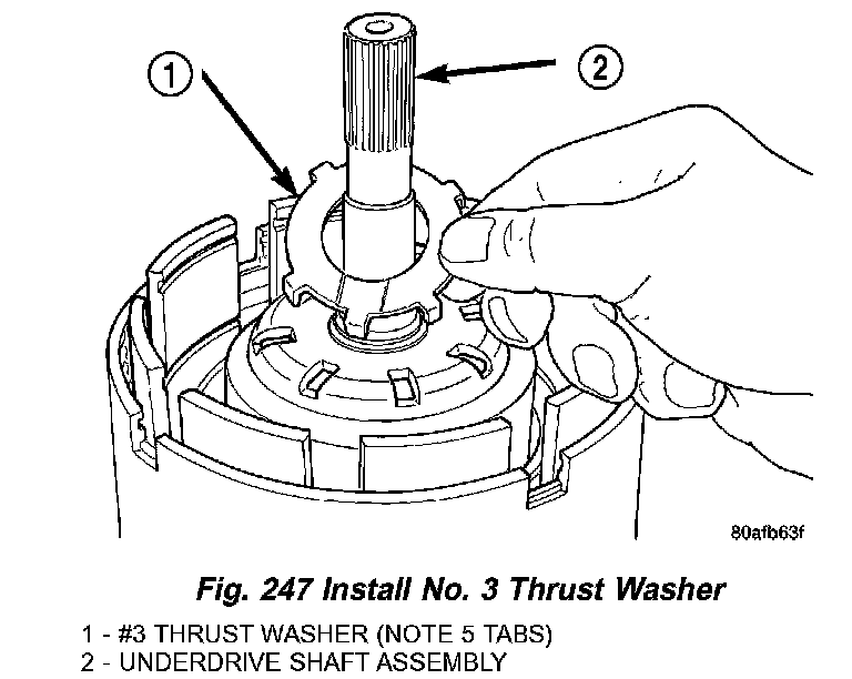 39. Install the #3 thrust washer to the underdrive shaft assembly. Be sure five tabs are seated properly (Fig. 247).