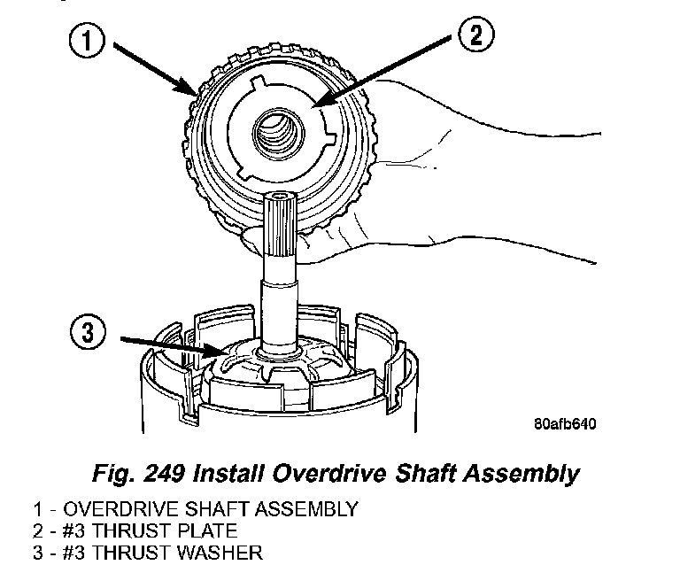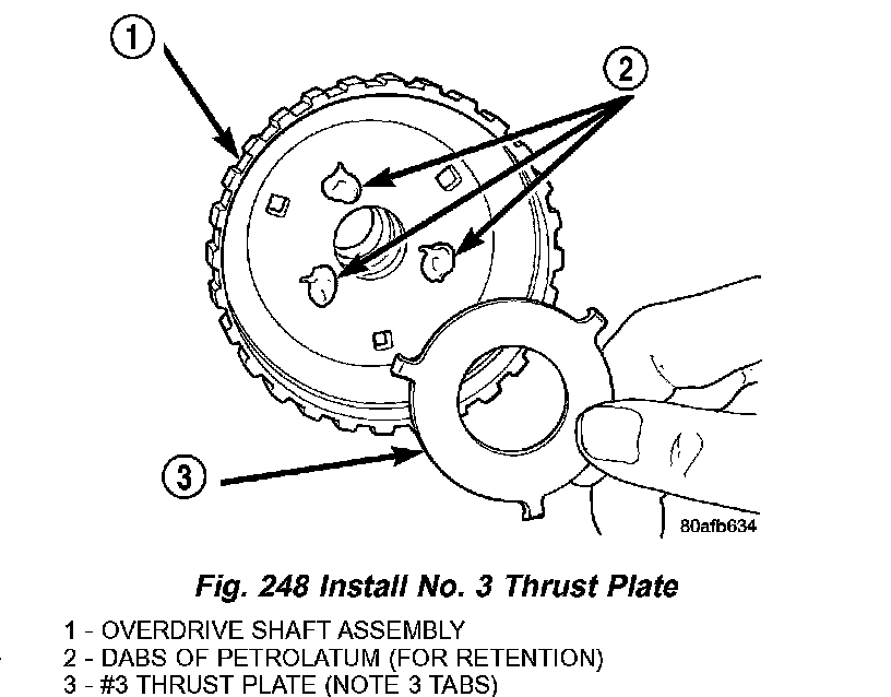 40. Install the #3 thrust plate to the bottom of the overdrive shaft assembly Retain with petrolatum or transmission assembly gel (Fig. 248).
