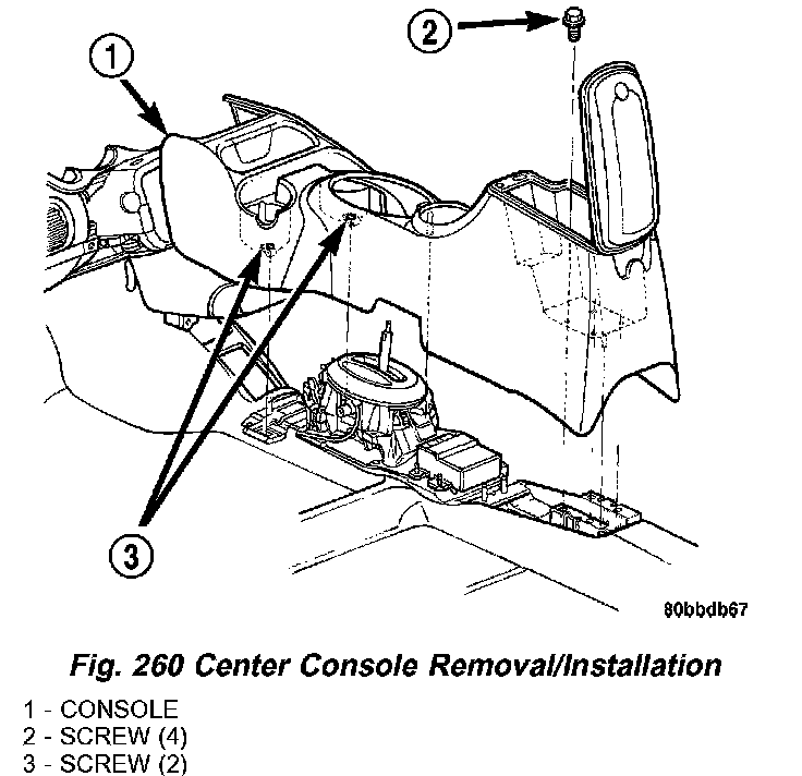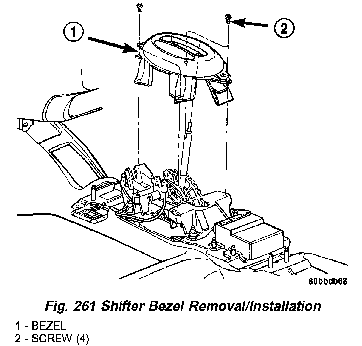 5. Disconnect the shifter/ignition interlock cable from the shifter lever and bracket as shown in (Fig. 262). Remove the cable core end from the plastic cam of the shifter mechanism and release cable from shifter bracket