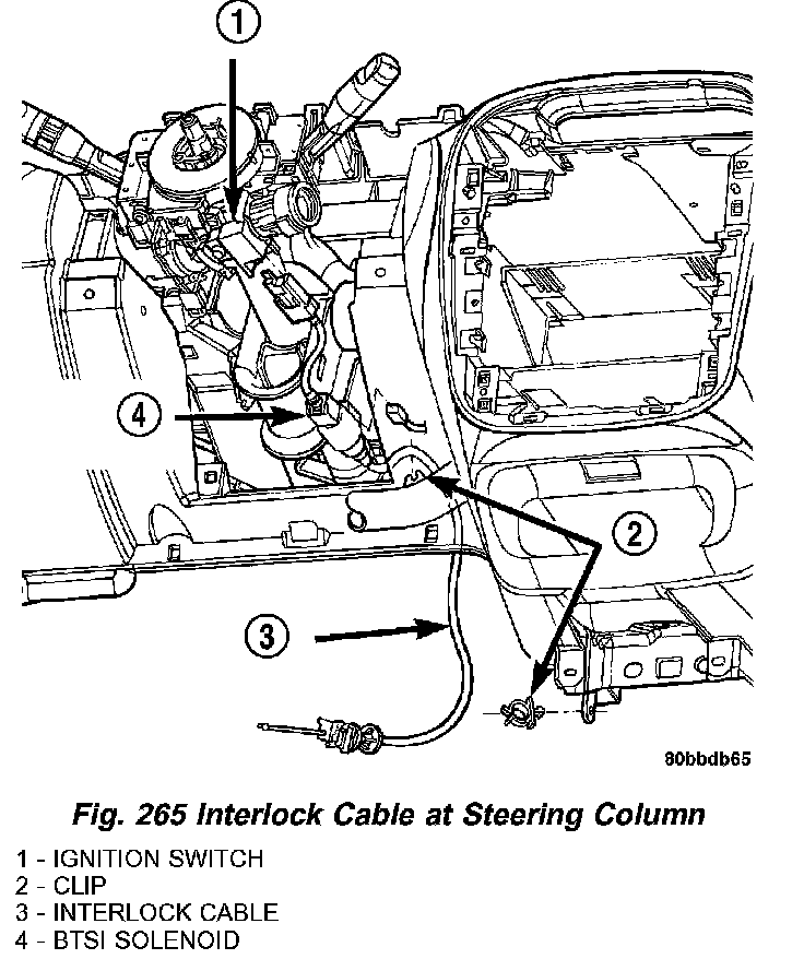 8. Disconnect the Brake Transmission Shift Interlock (BTSI) solenoid connector from the interlock cable (Fig. 265).