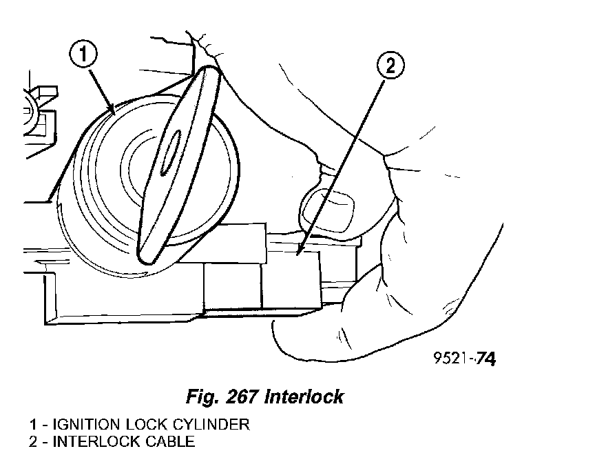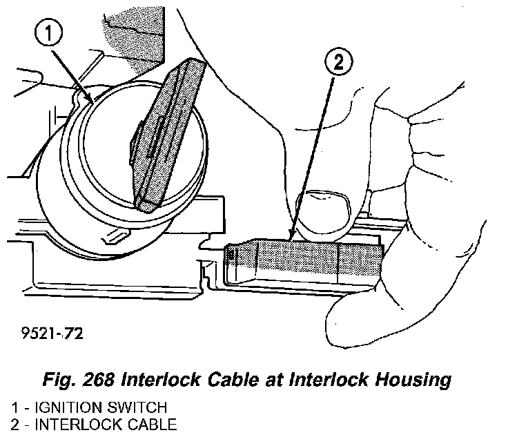 3. Install the interlock cable into the interlock housing at the steering column (Fig. 268). Verify the cable snaps into the housing and is fully seated.