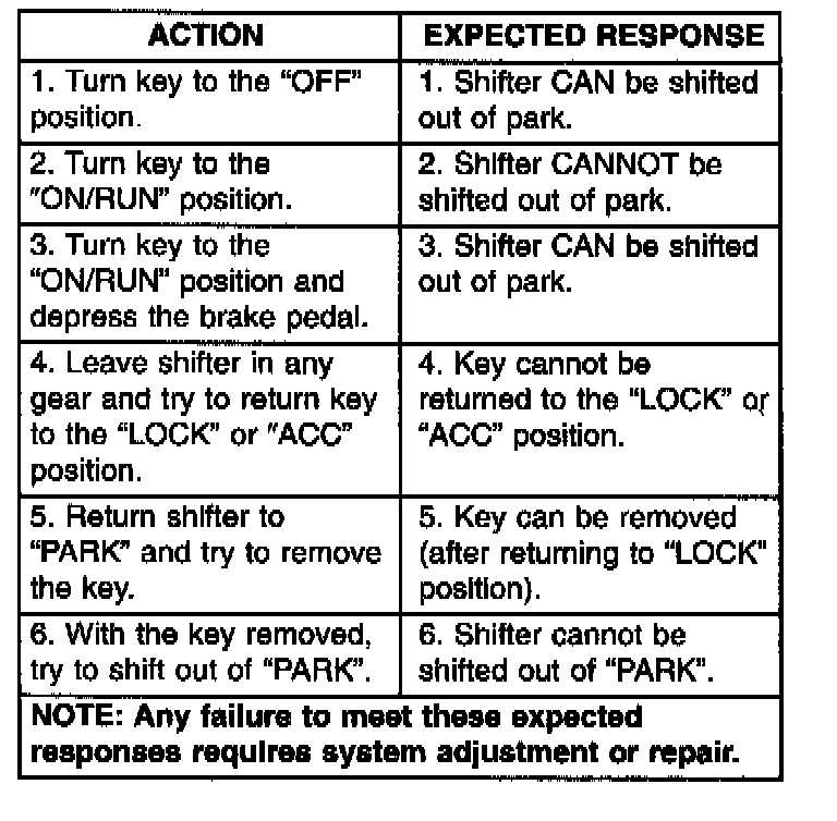 VERIFICATIONBrake Transmisssion Shift Interlock System Response Table: