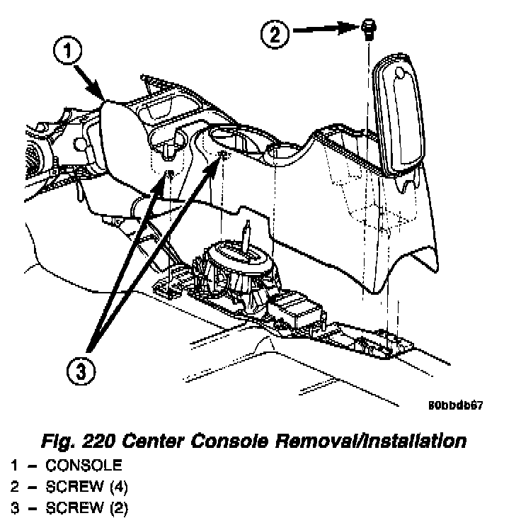 2. Remove the center console assembly as shown in (Fig. 220).