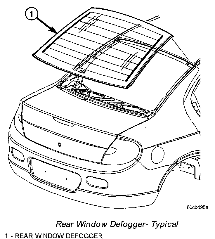 CAUTION: Grid lines can be damaged or scraped off with sharp instruments. Care should be taken in cleaning glass or removing foreign materials, decals or stickers. Normal glass cleaning solvents or hot water used with rags or toweling is recommended.Rear Window Defogger - Typical: