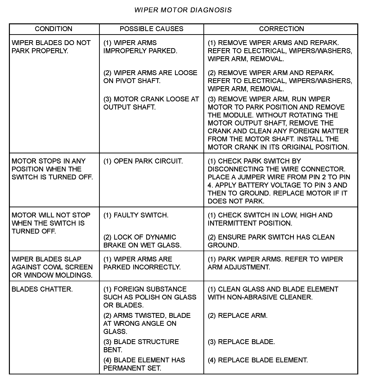 malfunction occurs, verify that the wire harness is properly connected, then start normal diagnosis and repair procedures. Refer to the WIPER MOTOR DIAGNOSIS table.