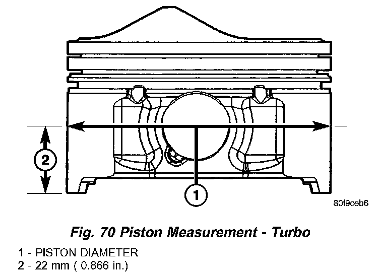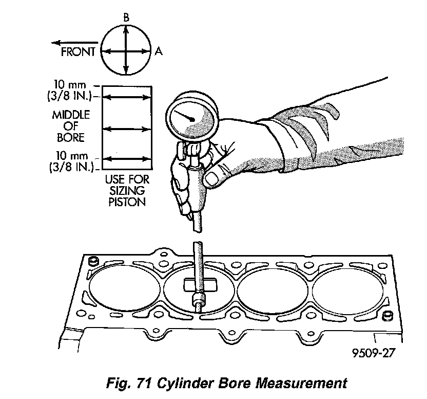Cylinder bores should be measured halfway down the cylinder bore and transverse (measurement location B) to the engine crankshaft center line shown in (Fig. 71). Refer to for Engine Specifications. Correct piston to bore clearance must be established in order to assure quiet and economical operation.