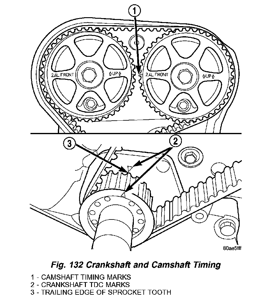 7. Rotate the crankshaft CLOCKWISE two complete revolutions manually for seating of the belt, until the crankshaft is repositioned at the TDC position. Verify that the camshaft and crankshaft timing marks are in proper position (Fig. 140).