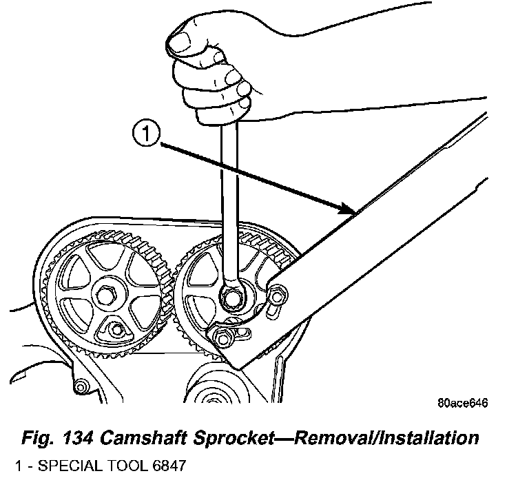 3. Use Special Tool 6847 to hold camshaft sprockets while removing the sprocket bolt(s) (Fig. 134). Remove camshaft sprocket(s).