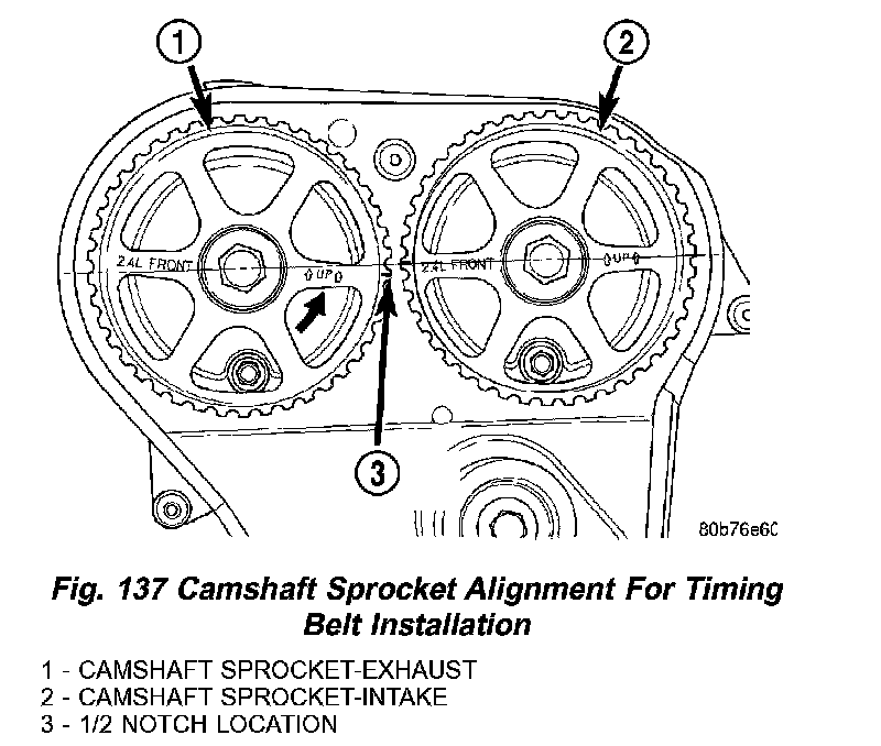 2. Set camshafts timing marks so that the exhaust camshaft sprocket is a 1/2 notch below the intake camshaft sprocket (Fig. 137).
