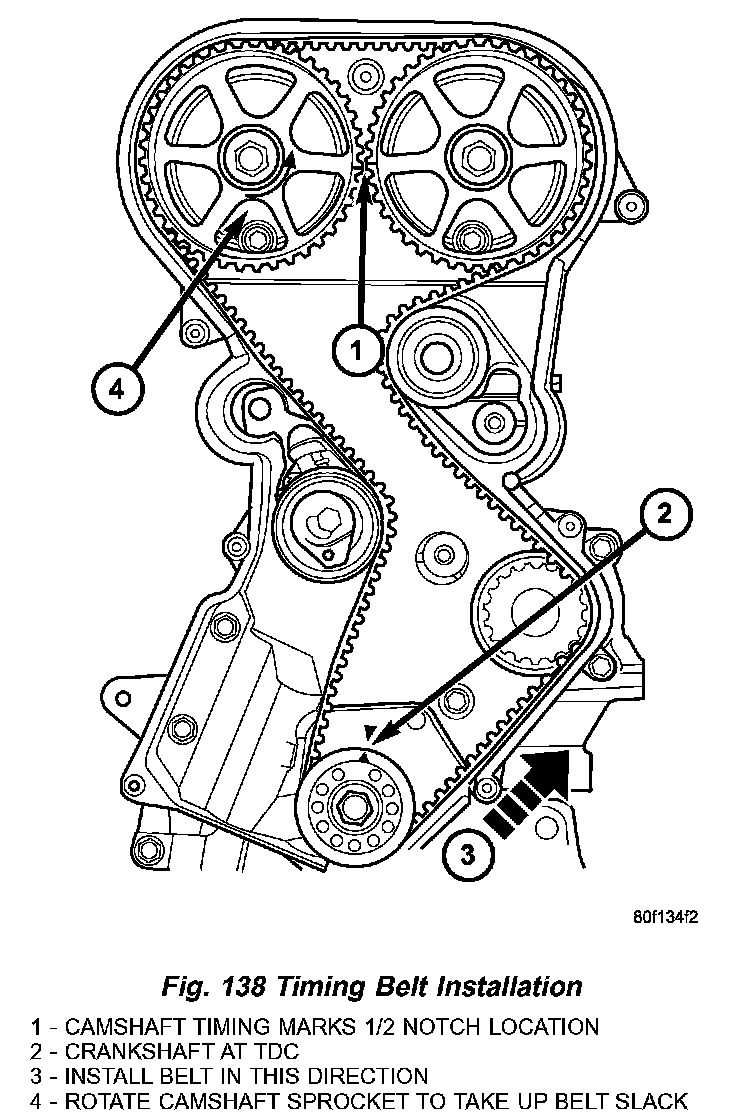 4. Move the exhaust camshaft sprocket counterclockwise (Fig. 138) to align marks and take up belt slack.