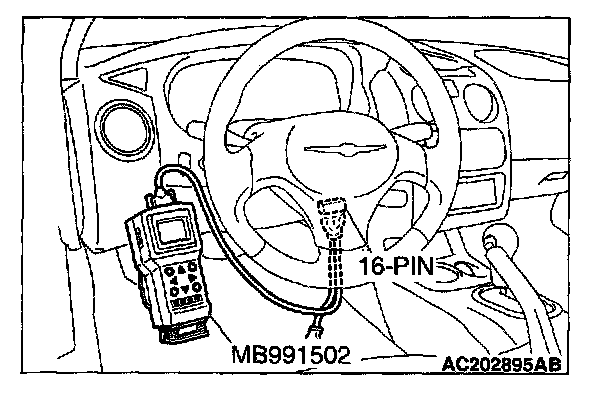 CAUTION: To prevent damage to scan tool MB991502, always turn the ignition switch to the LOCK (OFF) position before connecting or disconnecting scan tool MB991502.